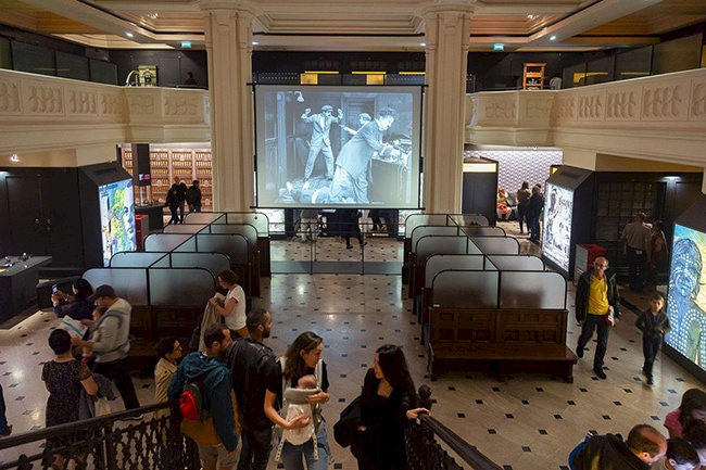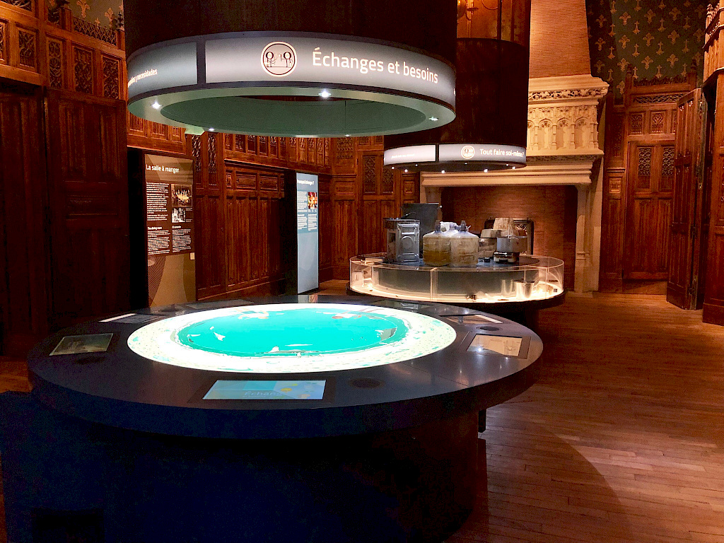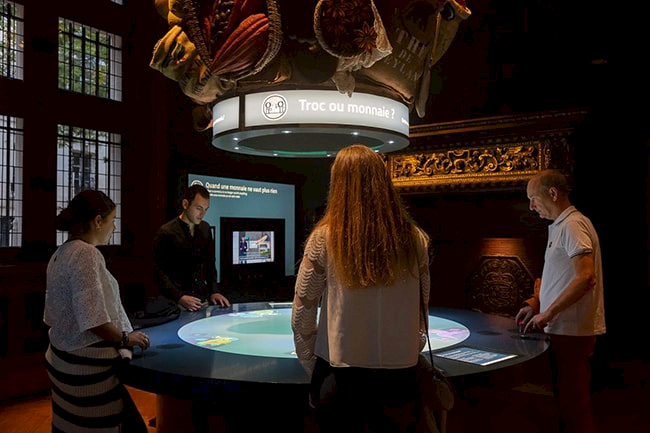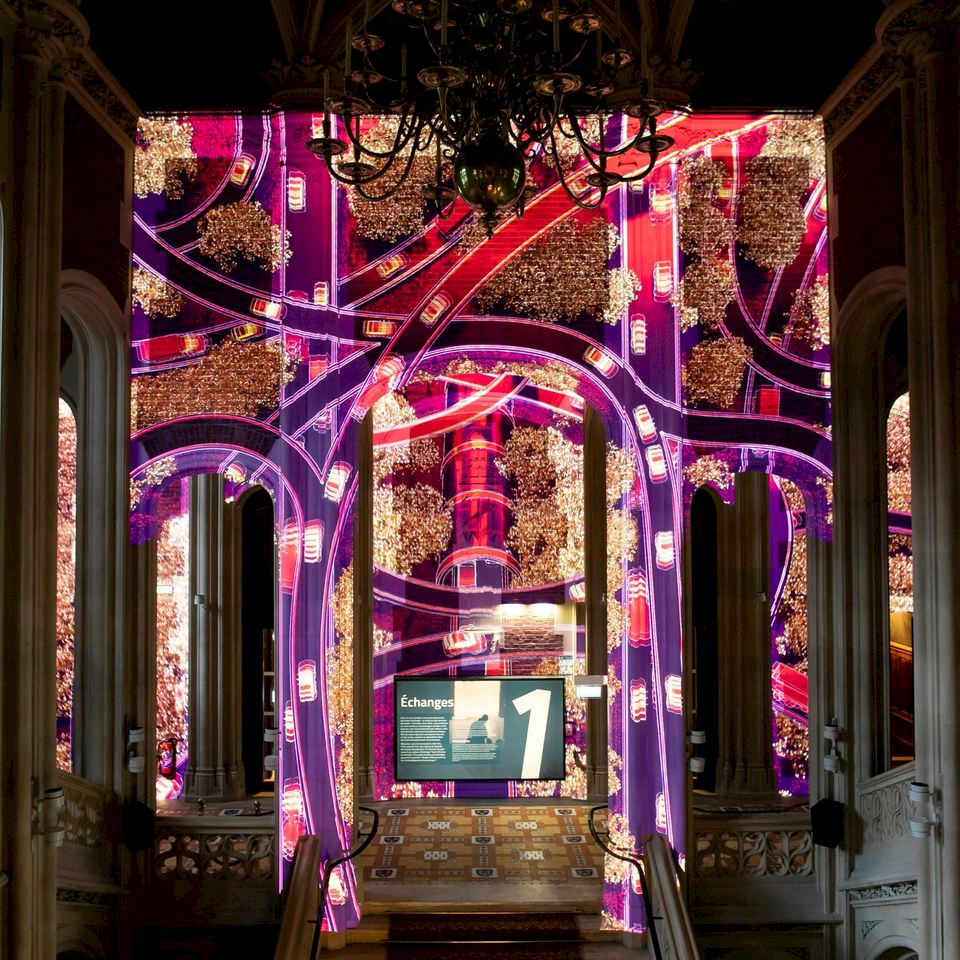 La visite commence par une installation audiovisuelle totalement immersive qui métamorphose le hall d’honneur : de grandes vidéo-projections d’images animées illustrent les questions contemporaines autour de l’économie et de la finance en respectant la place et la beauté initiale de l’architecture. Le parcours se poursuit ensuite au travers de différentes séquences, toutes en parfaite adéquation avec les structures des bâtiments et les aménagements remarquables des lieux.