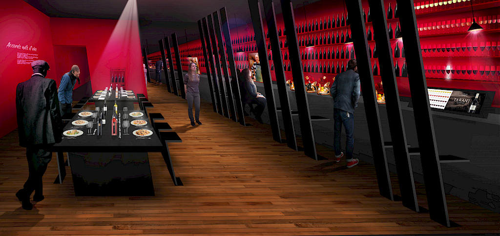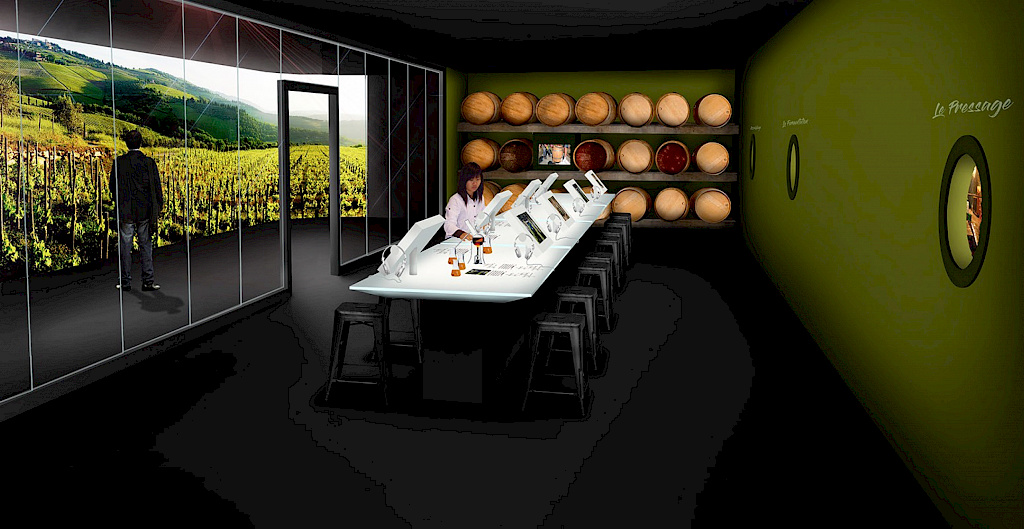 Il s’agit ici de recentrer le visiteur sur ses propres sensations, lui proposer des expériences sensorielles intimes et de le mettre en condition pour apprécier la dégustation. Le visiteur découvre les accords mets vin et est initié à l’oenologie.